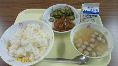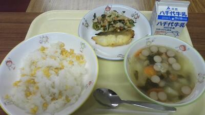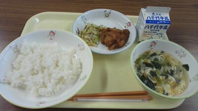 今日の給食(鶏肉の香味揚げ、キャベツのごま昆布和え、たまごと春雨のスープ)