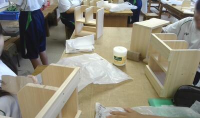 本日も生徒たちは頑張っています。1年生の技術科では、5月下旬から作り始めた本立てが完成に近づいてきました。どんな作品になるのか楽しみです。