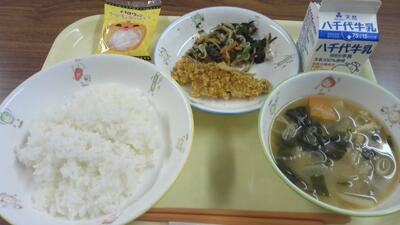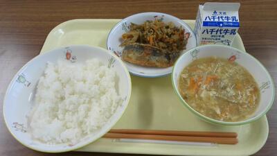 今日の給食(鰯の香味揚げ、五目きんぴら、村雲スープ)