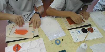 3年生の美術では、ポーチに模様を染色するカッティングスクリーンが行われていました。なかなか難しそうです。