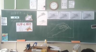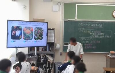 2年生の社会科は、江戸時代の産業の発達について学んでいました。大型提示装置には、この頃から栽培が広まっていった綿、紅花、菜種等の写真が映し出されたり、備中ぐわ、九十九里浜の地引網などが紹介されていました。徐々に現代とのつながりが増えて面白くなっていきます。