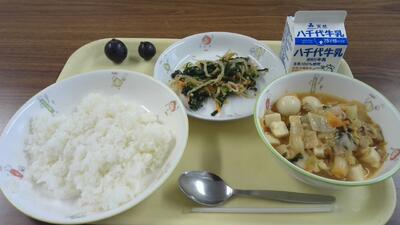 今日の給食(豆腐チゲ、中華和え、ぶどうピオーネ)