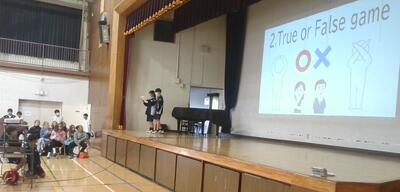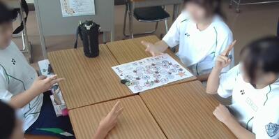 1年生の英語では、ALTとともに英語すごろくを使って学んでいました。消しゴムなどを駒にしてサイコロを振り、止まった場所の絵を見て英語で表現する授業でした。みんな楽しそうにしていました。