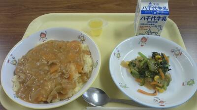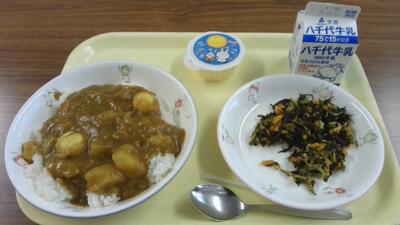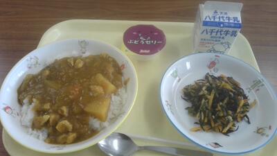 今日の給食(チキンカレー、ひじきとかぼちゃのマリネ、ぶどうゼリー)