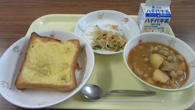 今日の給食(スイートポテトトースト、ポークビーンズ、豆苗の中華和え)