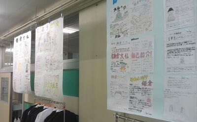 3年生の教室前廊下壁面には、思い出に残ったさざなみ祭の振り返りレポートが掲示してありました。反省とともに、今後にどのように生かしていくかを生徒一人一人が紙いっぱいに記載していました。