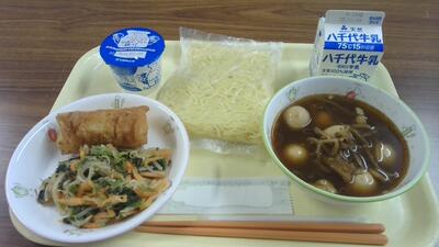 今日の給食(高野豆腐入りチーズ卵焼き、ひじきの味噌煮、けんちん汁)