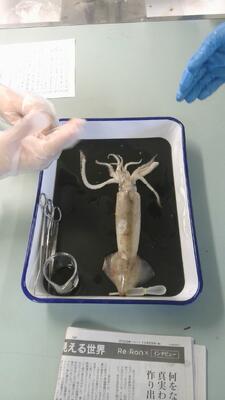 2年生の理科の授業では、イカの解剖をしていました。無脊椎動物の体の構造を観察する授業です。はさみをいれたり、吸盤を手袋越しに触って確認したり、様々な視点から観察していました。