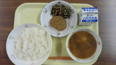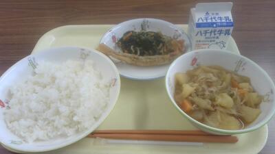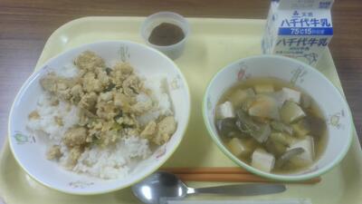 今日の給食(チキンたれかつ、キャベツのおかか和え、豚汁)