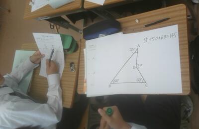 2年生の数学では、「図形の性質を使って、簡単に角度を求める方法を考えよう」という授業を行っていました。班内で意見を出し合って活発に討論していました。