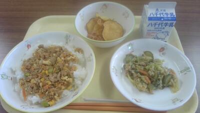 今日の給食(ツナと卵のそぼろ丼、焼き肉サラダ、さつまいもとレンコンチップス)
