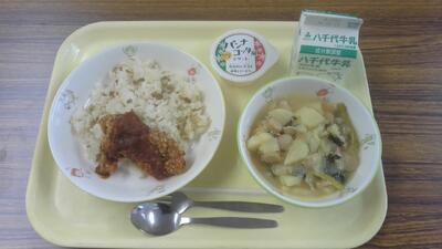 今日の給食(菜飯、ツナ餃子、白菜と小松菜のにびたし、若鳥の味噌煮)