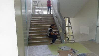 昨日に続き、近隣校の用務員さんがペンキ塗りをしてくれています。どんどんきれいになります。