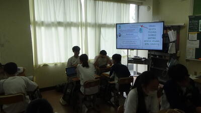 ①パソコン室ではALTと2学期に行われるスピーチコンテストに参加する生徒がスピーチの練習していました。
