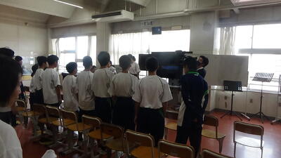 生徒会長のあいさつの後、立候補者の演説、応援責任者の演説がありました。それぞれ立派な演説でした。そして、すべての候補者が信任投票で当選しました。(第二理科室と各教室をチームスでつないで行いました。)