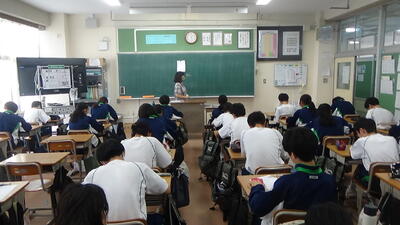 先生が先に音読して、その後、生徒たちが続いて音読しました。次に先生が日本語で文章を読んで、生徒たちは、その後に英文にして音読しました。そして音読した文書に関するプリントが配布され、音声の英文で問題が出され生徒は問題に取り組んでいました。たくさん英語に触れています。