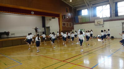 体育館では、創作ダンスのウォーミングアップで先生とともに踊