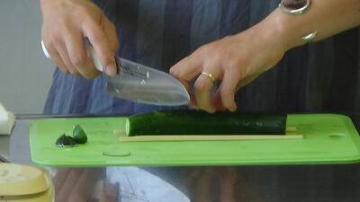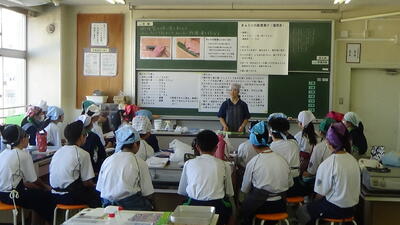 調理室でキュウリの即席漬けを作っていました。先生の包丁さばきが素晴らしかったです。生徒たちは真剣に見ていました。
