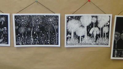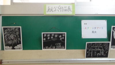 花火を描いた作品が廊下に飾られました。夏の思い出ですね。