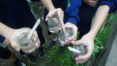 土の中の微生物を採取して、寒天の中に入れて育つか、実験をしていました。結果は1週間後に出るそうです。生徒たちはみんな興味深々でした。