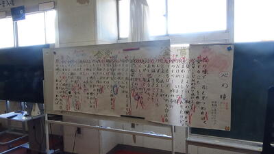 さざなみ祭に向けて、合唱曲を一生懸命練習しています。歌詞を書いた模造紙にはたくさんポイントが書き込まれています。