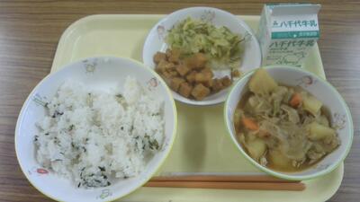今日の給食(わかめご飯、高野豆腐のカレー揚げ、キャベツのごまだれ、肉じゃが)