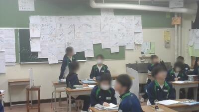 1年生の国語は、「言葉がつなぐ世界遺産」を題材に、本論を読み、事例をまとめる授業をしていました。多くの段落の中から事例を探し出し、つなげていく作業に真剣に取り組んでいました。