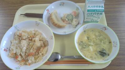 今日の給食(キムチご飯、揚げ餃子、ポテトサラダ、中華風コーンスープ、ミルメークココア) ※3年生のリクエスト給食でした。