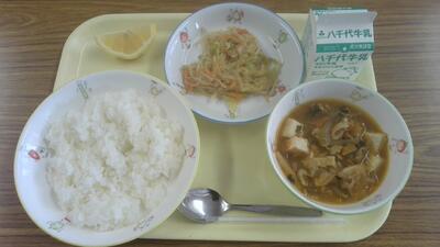 今日の給食(ジャージャン豆腐、バンサンスー、はるか)