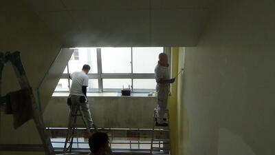 昨日に続き、近隣校の用務員さんがペンキ塗りをしてくれています。どんどんきれいになります。