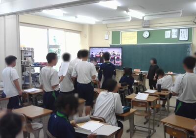 葦の渚学級では、左右に分かれたクラスメイトからの応援を受けながら反復横跳びをしていました。みんな元気です。