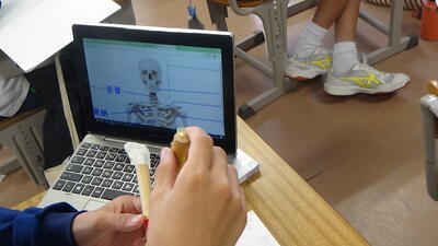 骨と筋肉について一人に一つ骨と筋肉の模型が配られ、それをを用いて学習していました。