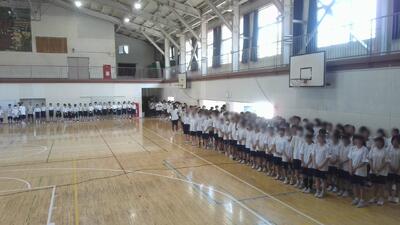 朝の会修了後、リモートで終業式を行いました。まず1学期に活躍した生徒たちを体育館に集めて表彰を行いました。(部活動、強化選手、健歯)その後、校長、生徒指導主任からの話で式が終了しました。