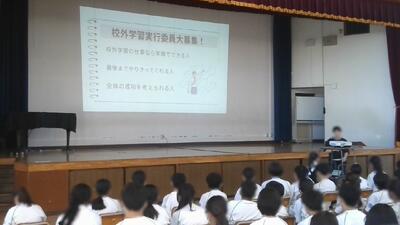 1年生は体育館で、校外学習実行員の募集やさざなみ祭など、これからの活動について説明していました。