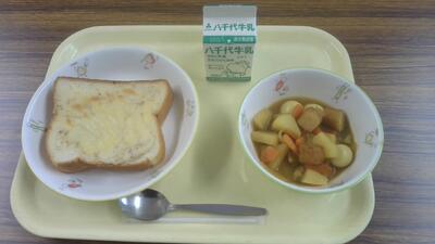 今日の給食(白いんげん豆のチーズトースト、インド煮)