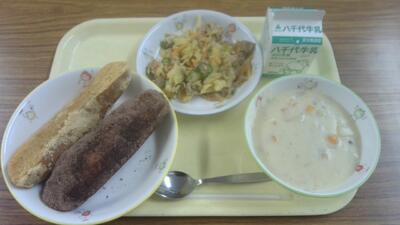 今日の給食(欲張り揚げパン、クラムチャウダー、焼き肉サラダ)