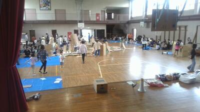 「まちをダンボールでつくろう」ということで福栄中の生徒が南新浜小学校の体育館でボランティアに17名が参加して子供たちと活動をしています。