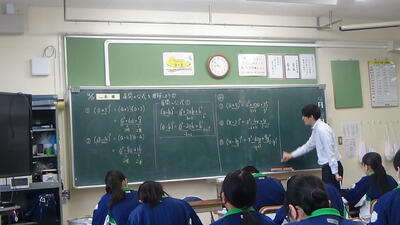 3年生、数学の授業では、はじめに計算問題でウォーミングアップをしてから本題に入っていました。「今日の目標は、展開の公式を理解しよう」ということで公式を習いながら、徐々に難易度を上げながら問題に取り組んでいました。