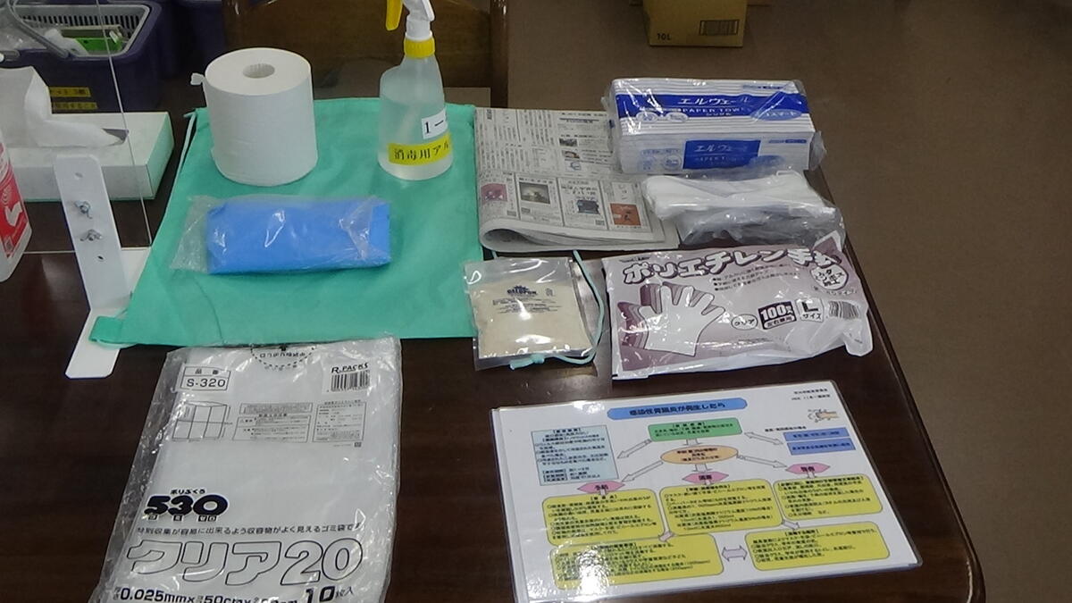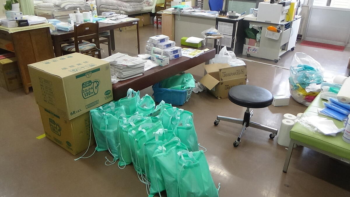 保健室では養護教諭が新学期に備え、教室に常備する嘔吐物処理セットの確認作業をしています。もしもに備えますが使わないことベストです。