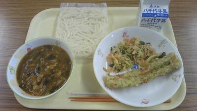 今日の給食(カレーうどん、ちくわの磯部揚げ、ごま酢和え)