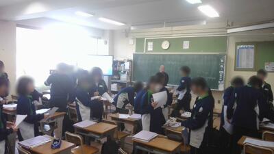 今日の2年生の英語は、現在完了形の学習をしていました。定型の会話文から、実際の会話に応用し、ペアを作って話していました。他のクラスでは、ALTが英語で「利き手と逆の手を使って」や「目をつぶって」等の指示に従って、クリスマスの絵を描いていました。描いた後は、席を移動して友達に説明をしていました。
