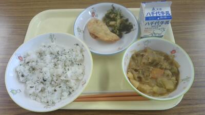 今日の給食(わかめご飯、ツナ餃子、白菜と小松菜のおかか和え、肉じゃが)