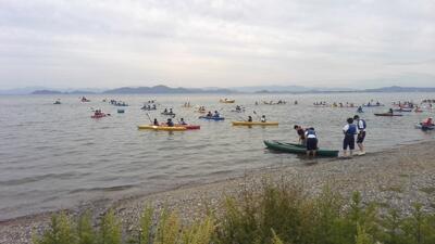 琵琶湖に到着しました。アクティビティにこれから取り組みます。天候は曇りですが、風もなく適温です。