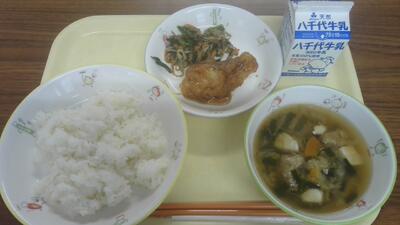 今日の給食(白身魚のゆずあんかけ、のりおかか和え、塩ちゃんこ汁)