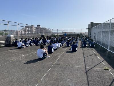 体育館に移動後、津波を想定しての屋上避難訓練も同時に行いました。