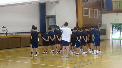 男子バレー部は集合してしっかりとした姿勢で話を真剣に聞いています。返事の声も大きくなってきました。