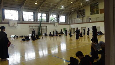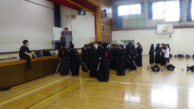 体育館では剣道部が他校を招いて練習試合を行っていました。生徒たちが審判ができるようになってきました。