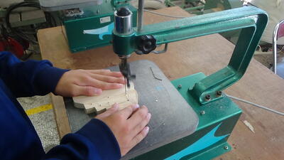 木工室で行灯制作をしています。作業で糸鋸を使っていました。