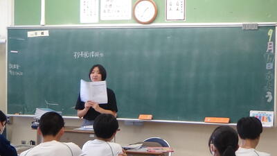続いて校長からの話です。夏休みの部活動、まなびくらぶ、海外派遣、生徒のボランティア、教職員の研修等の写真をスライドショーで振り返りました。その後、2学期に向けて3つのお願いをしました。①学級目標の達成について②話し合い・協力を大切にすること③安心・安全を守る。