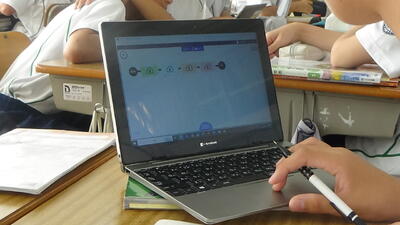 目標「一次関数のグラフと式の関係を考えよう」ということで各自が端末でムーブノートという機能を使って、各自の考えを書き込んでみんなで考えを共有していました。